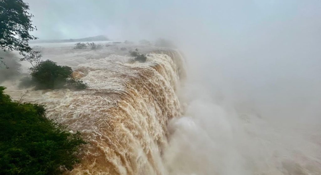 As Cataratas do Iguaçu estão, na manhã deste sábado (13), com vazão mais de quatro vezes acima da normal, como reflexo das chuvas das últimas 48 horas nos estados de Paraná e Santa Catarina, na região da Bacia Hidrográfica do Rio Iguaçu.