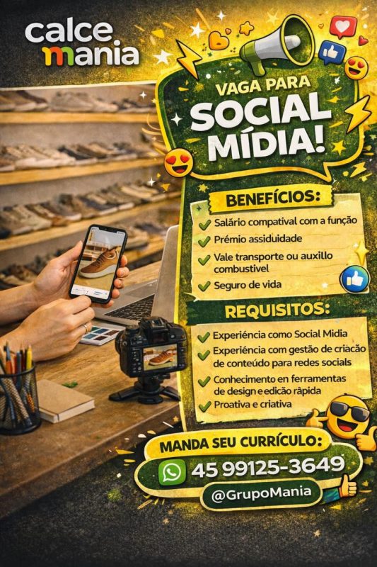 Os interessados em aceitar o desafio e transformar a comunicação da Calce Mania devem encaminhar currículo diretamente para o WhatsApp (45) 99125-3649.