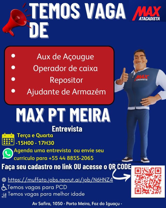 O Max Atacadista do Porto Meira está com vagas abertas para compor a equipe da unidade em Foz do Iguaçu. As oportunidades são para auxiliar de açougue, operador de caixa, repositor e ajudante de armazém.