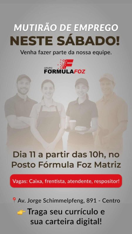 As vagas são ofertadas pelo Grupo Fórmula Foz. A empresa atua no mercado desde 1999, com três lojas na cidade.