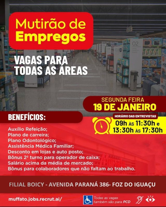 O Grupo Muffato promoverá mutirão de empregos nesta segunda-feira, 19, incluindo vagas para profissionais sem experiência. Há opções para todas as áreas operacionais da empresa.